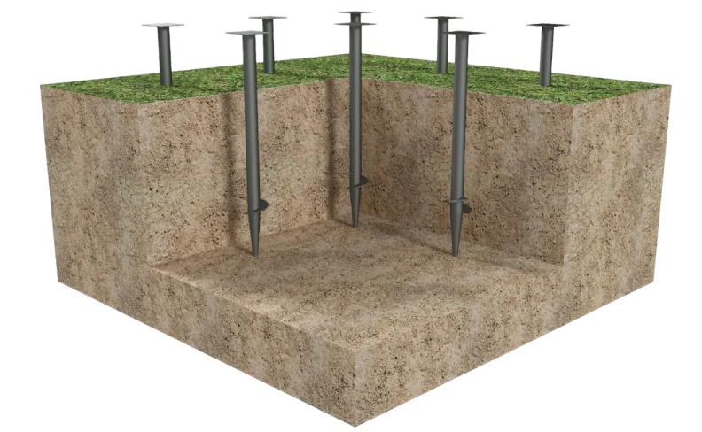 2. Установка винтовых свай: специальное оборудование используется для вкручивания свай в грунт до достижения требуемой глубины.